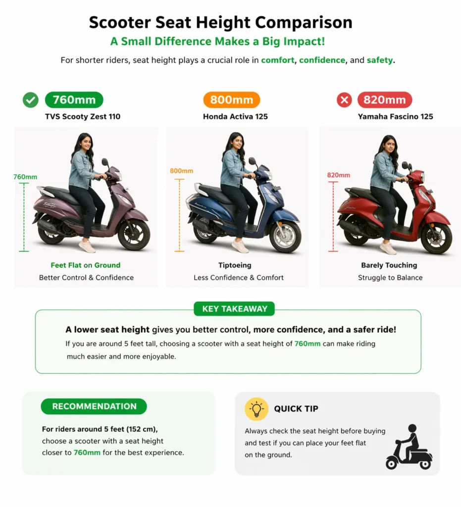 | TVS Scooty Zest 110 | 760mm ✅ | 108 kg | ₹73,000–75,000 | Shortest riders / Budget |